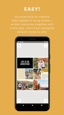 Built-in templates and pre-designed artwork allow for scrapbook pages to come together in just minutes with a few taps on our intuitive page layouts. Create a photo collage with your photos and hundreds of fantastic designer cards, with more designs added monthly. Add some quick journaling notes and you’re done! Pocket scrapbooking and photo journaling have never been easier!